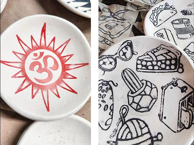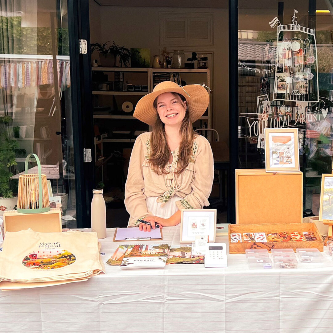 Studio van Mieke staat met haar kaarten, prints en keramiek op de kunstmarkt. Je ziet Mieke Wijnen daar ook aan het werk.